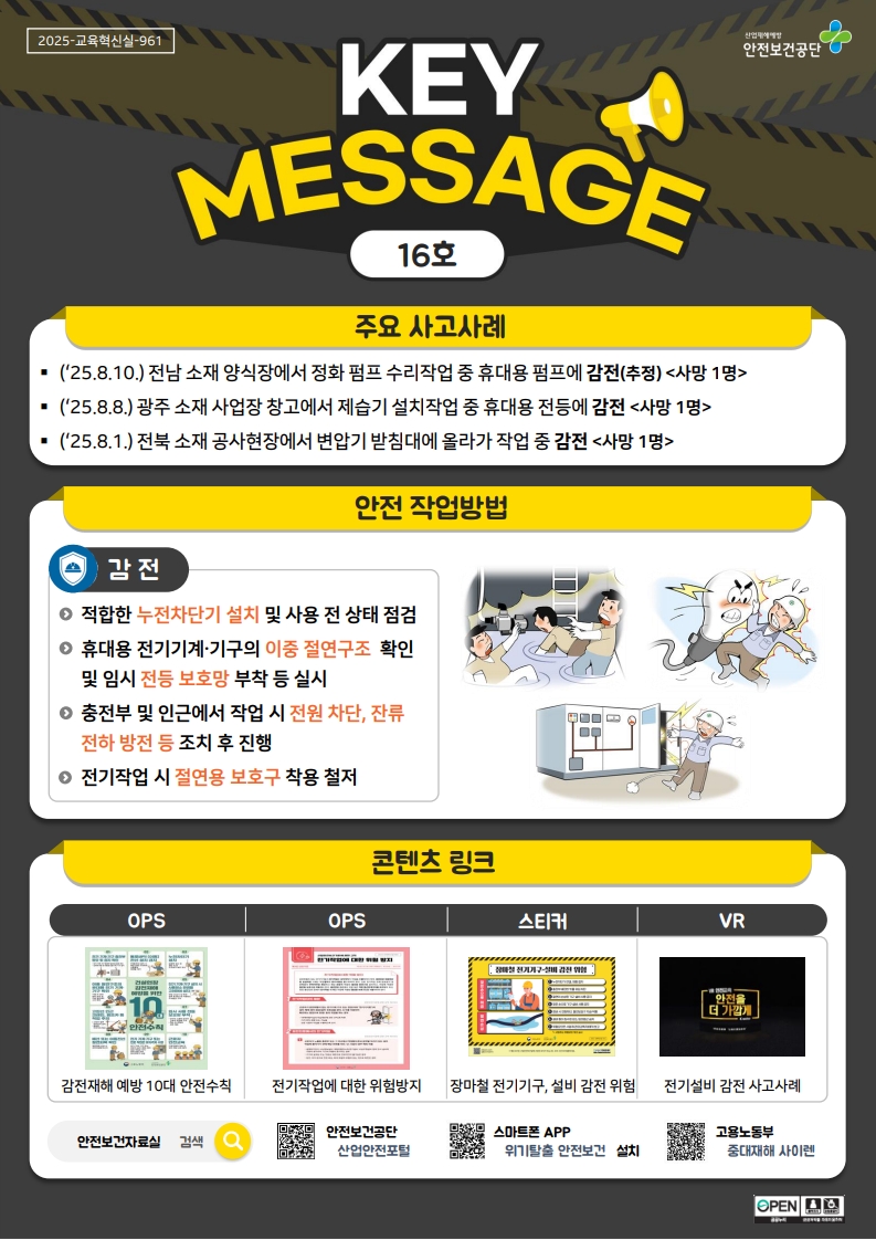 안전보건공단 안전보건자료실에 키메세지(16호_감전) 자료가 게시되었으니